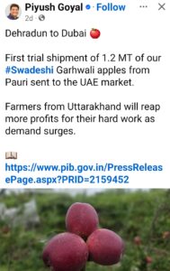 भारत सरकार के वाणिज्य एवं उद्योग मंत्री पीयूष गोयल ने अपने सोशल मीडिया अकाउंट पर एक पोस्ट शेयर की है। जिसमें उन्होंने गढ़वाल के सेब की दुबई भेजी गई पहली खेप की जानकारी दी है और लिखा है ‘देहरादून टू दुबई’। गढ़वाली सेबों की यह खेप केवल एक शुरुआत है, जिसके जरिये शीत श्रृंखला प्रबंधन, फसल कटाई के बाद हैंडलिंग और लॉजिस्टिक्स व्यवस्था को और बेहतर बनाने का अनुभव मिलेगा। एपीडा और उत्तराखंड सरकार की साझेदारी से आने वाले समय में और अधिक किसान समूहों को इसका लाभ मिलने की उम्मीद है। साथ ही, दक्षिण-पूर्व एशिया और यूरोप जैसे नए निर्यात बाज़ारों में भी उत्तराखंड के कृषि उत्पादों की पहचान बनने की संभावनाएं प्रबल हो गई हैं।